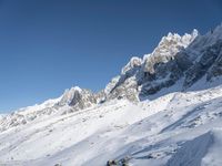 This stock photo features a picturesque winter scene in France. The image showcases a snow-covered mountain side in the Alps region, specifically the famous Mont Blanc and Aiguille du Midi. People are seen standing near the mountain, holding skis in hand and one person has ski poles. The open space and clear sky create a stunning backdrop for this serene nature setting. It's a perfect representation of the beauty and tranquility of the European winter in the French Alps.