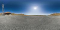 a panorama camera photograph of the road with a pole in the distance and mountains in the background
