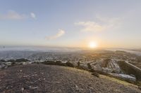 An off-road adventure in the mountains of San Francisco. The dawn light casts a warm glow on the landscape, revealing a stunning view of the sea and distant horizon. Gravel road winds through the winter atmosphere, offering a recreational overview of the area.