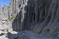 A rugged mountain landscape with a clear sky. The dirt road winds through the rocky terrain, showcasing the natural formations and vegetation. Off-road track leads to a scenic canyon with exposed bedrock and rock outcrops.