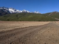 A scenic road winding through the highlands of Yunnan, China. The dirt track leads to an old village nestled in the mountain range. Snow-capped peaks and a picturesque landscape create a captivating natural environment.