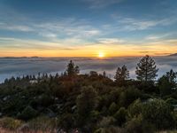 an orange sky above the clouds on a mountain side at sunset with trees and hills below
