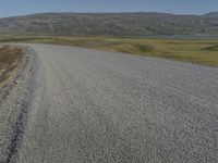 This is an image of a road in Iceland, surrounded by grass and mountains. The road surface is covered in dirt and gravel, giving it a rugged look. The landscape showcases the natural beauty of Iceland, with clear skies and vast land lots. This photo represents the untouched beauty of the European island nation of Iceland, where nature and the environment are prioritized.