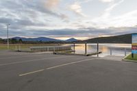 This image captures the beauty of a rural road at dawn. The asphalt surface stretches through the plain, surrounded by majestic trees. The street lights illuminate the path, guiding the way in the early morning hours. In the distance, mountains rise against the clear sky and clouds float overhead. The road leads to a boat ramp on the shores of a serene lake that meets the calm ocean waters. This peaceful scene represents the tranquility and natural beauty of the coastal region. Explore the wonders of this idyllic location, where land and water meet.
