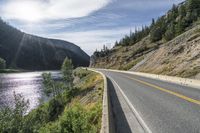 A stunning view of a car driving down a straight road along the mountains in British Columbia, Canada. The road winds through the breathtaking landscape, with lush vegetation and trees lining the road. The road surface is made of smooth asphalt, while a guard rail and Armco barrier provide safety. The road runs parallel to a river below, with the ocean visible in the distance. Clouds dot the sky, adding to the picturesque scene. This stock photo captures the beauty of nature and the adventurous spirit of exploring mountain roads in British Columbia, Canada.