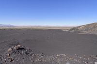 This image captures the rugged natural environment of California, USA. The desert landscape is composed of sand, dirt, and gravel, with an open space extending to the horizon. The mountain landforms create a dramatic backdrop, with rugged rock surfaces and volcanic features. The clear sky overhead highlights the geology and unique surface of the area. This photo represents the wilderness and off-road potential of California, offering opportunities for exploration and adventure. The Pisgah crater is also visible, adding to the scenic beauty of the region.