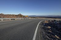 a sign on a curvy highway in the desert, with the view of a desert in the background