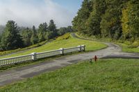 This stock photo captures a scenic mountain road in North Carolina, USA. The road is lined with lush green vegetation, creating a beautiful and picturesque landscape. The road curves through the mountains, offering breathtaking vistas of the surrounding valley. The day is sunny, illuminating the landscape with natural light. The road is elevated and surrounded by tall trees and fog adds a touch of mystery to the scene. The grey sky adds a gloomy yet captivating atmosphere to this rural destination. With its scenic views and recreational opportunities, this mountain road in North Carolina is a must-visit for nature lovers and adventure seekers alike.
