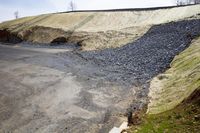 a steep mountain of gravel and some dirt is shown to the left of the road