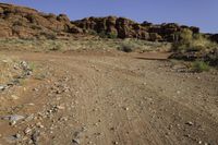 Utah's stunning desert landscape with red rock outcrops and sparse vegetation. A road winds through the mountains, showcasing the region's natural beauty. Clear skies and brown sand complete the scene.