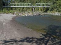 This is an image captured from a top-down perspective, showing a coastal landscape. The photo features a lake with clear blue water and a sandy shore. The surrounding area is covered in lush vegetation, including trees and beach grass. A creek flows through the landscape, creating fluvial landforms and adding to the natural beauty. A bridge spans the creek, connecting the elevated road to the open space on the other side. The scene is illuminated by the bright sunlight, casting hard shadows on the surface. In the distance, a high hill and mountains can be seen. Overall, the image captures the serene beauty of a coastal oasis.