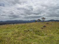 A single tree stands tall on the side of a mountain in Pambula, New South Wales, Australia. The rugged landscape and dramatic grey sky lend a sense of gloom to the scene. An open grassy field stretches out into the valley below.