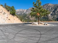An open space at the base of a mountain trail in California, USA. Clear sky and a tree provide a serene backdrop. The day is perfect for hiking on the dirt and gravel surface. Nearby, an asphalt road offers easy access.