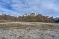 From the top of a hill, enjoy the view of snow-capped mountains in Italy. The landscape features a grassy hill area with an open space and a gloomy grey sky. A serene and peaceful scene.