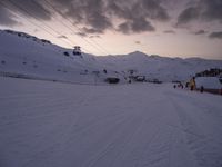ski lift is sitting on the snow near the mountains at dusk overlooking a ski slope