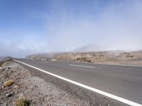 a road near the mountain side in the foggy sun day, and on the opposite bank are hills