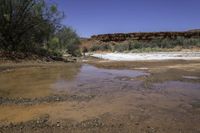 a muddy stream with some bushes on the side and rocks in the background and a rock wall