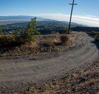 A rugged dirt road winds through the picturesque landscape of Mulholland, California. Power lines dot the side, while hills serve as a backdrop. A clear sky and cityscape create a stunning overview of this recreational off-road track.