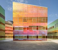 A stunning multicolored high-rise office building located in Holland, Netherlands. The building features a unique rainbow pattern on the windows, surrounded by two green buildings. The urban design and modern architecture of this property make it a prominent feature in the business district. With clear skies and open spaces, this building stands tall against the backdrop of the European cityscape. The rectangular shape and clean lines of the building's structure perfectly complement the asphalt and gravel surface of the road. This image captures the essence of successful businesses and contemporary designs in Holland.