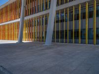 a concrete structure made into rows of orange and yellow poles are on a cement sidewalk