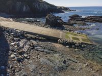 A scenic coastal landscape in Portugal, with clear skies and open space. The high waterfront terrain features a mix of sandy beaches, rocky bedrock formations, and urban design elements. Accessible via an elevated boat ramp.