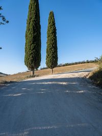 This is an image of a rugged road in the rural landscape of Tuscany, Italy. The clear sky above highlights the natural beauty of the area. The road is lined with cypress trees and there are sand streets leading to the nearby garden. The landscape exudes the charm of Tuscany with its picturesque views and rustic atmosphere. This photo captures a serene day in the heart of Europe, where nature and culture combine to create a unique and timeless setting.