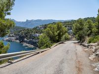 A scenic coastal road in Mallorca, Balearic Islands, Spain. Clear blue sky and the shimmering waters of the ocean create a picturesque backdrop. The road is lined with Armco barriers and leads to a peaceful harbor with a jetty and landing pier.
