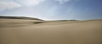A man sitting in a desert landscape, gazing at the horizon filled with sand dunes. Open space and nature surround him, as the brown sand creates a mesmerizing terrain. A serene day in the desert.
