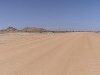 This is an image of an endless road cutting through a vast desert landscape in South Africa. The brown, beige, and tinted shades of the plain extend towards the horizon, with the clear sky above. The road surface is made of dirt and gravel, suitable for off-road tracks. Along the road, sparse vegetation can be seen, including trees and plants. This photo captures the natural environment of the African desert, with its Aeolian Landforms and endless roads. It represents the adventure and freedom of exploring the vast landscapes of Africa.