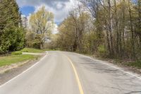 A scenic view of a lush green landscape in Ontario, Canada. The road surface winds through the trees and vegetation, leading to a picturesque driveway entry. Clear blue skies and fluffy clouds complete the serene ambiance.