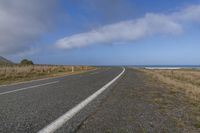 a long straight asphalt road near the ocean on a sunny day with a dark cloud overhead