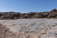 A rugged landscape in Utah's Needles District in the USA. The clear sky provides a backdrop for the red rock formations and ancient history on the surface. The canyonlands reveal the unique geology and formation of the area.