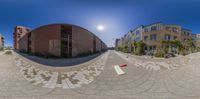 a photo taken from a fish eye lens shows a skateboard that is laying on the ground