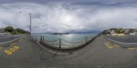 Gloomy grey sky hangs over the coastal town of Nelson in New Zealand. A fish eye view captures the beach in the middle of town, with the straight road leading to the ocean. Infrastructure, including guard rails and handrails, line the road.
