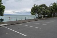 a parking lot is lined with trees next to the ocean and a bench sitting at the edge of it