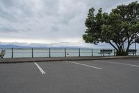 The gloomy parking lot at Nelson's Sunderland Marine Pier offers a somber view of the grey sky and coastal waters. Cars parked along the asphalt road, with a bench overlooking the ocean.