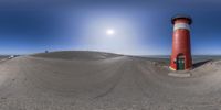 A picturesque scene on the coastal beaches of the Netherlands. A red and white lighthouse stands tall against the clear azure sky. The sandy beach stretches out towards the calm ocean, creating a serene and peaceful atmosphere.