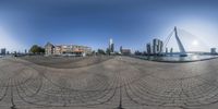 A stunning fish-eye view of a city in the Netherlands at sunrise. The cityscape is a mix of modern and traditional architecture, with skyscrapers, bridges, and sailboats. The water reflects the azure sky, creating a serene and picturesque atmosphere.