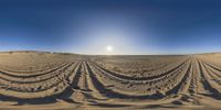 Aerial view of a sandy coastal landscape in the Netherlands. The dirt track cuts through the open grassy terrain, with the clear sky and calm ocean creating a serene atmosphere. A unique perspective captured through an upside-down fish-eye lens.