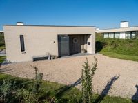 This image features a modern residential villa in the Netherlands. The house, made of clay and gravel, is surrounded by open space with a clear sky above. The architecture reflects modern design, with large windows and doors that open onto a paved patio. The driveway is made of asphalt and leads to the entrance of the property. The landscape showcases the beauty of the Dutch countryside, with grass and vegetation in the surrounding area. This photo captures a typical day in Holland, showcasing the combination of modern architecture and natural beauty.
