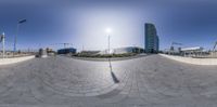 A fisheye view of an open space in the heart of a bustling city in the Netherlands. Modern architecture lines the straight road, with a curve leading to a business district. The urban design includes a bus stop for easy access.