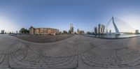 A panoramic view of a modern cityscape in Holland, with a river and bridge. The city is bathed in sunlight, creating a beautiful contrast between the tall skyscrapers and the azure water. The perfect blend of urban design and natural beauty.
