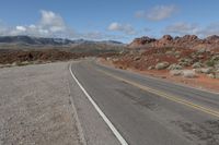 An empty road winding through the Nevada desert, surrounded by majestic mountains. The asphalt stretches into the distance, inviting a road trip through the stunning Southwest landscape. A lone motorcycle rests by the side, waiting for its next adventure.
