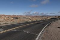 a lone motorist rides down the road next to some rocks and desert with mountains