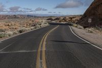 A straight road lined with desert landscape in Nevada, USA. The asphalt road curves through the red rock mountains, creating an S-curve. A perfect road trip route for exploring the Southwest's natural beauty.