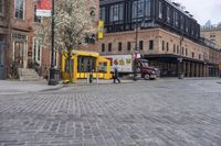 A classic brownstone building in Manhattan, New York. Cobblestone streets lined with beautiful architecture and urban design. Cars and vehicles pass by on the busy road, capturing the essence of city life.
