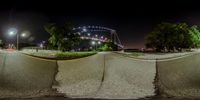 Nighttime in New York City, an empty street with a view of a bridge in the distance. Clear sky and artificial light create a captivating cityscape. The urban landscape showcases the iconic metropolitan area of Manhattan.