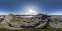 a 360 - view photo of the beach with cliffs and grass near water at low tide