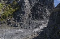 a small mountain is shown with a man walking by it and the top half has mossy rocks