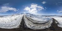 A panoramic view of a snow-covered road in New Zealand. The road stretches straight ahead, overlooking mountains and a serene natural landscape. The dawn breaks, casting a beautiful light on the surface of the road. A perfect spot for recreational activities.